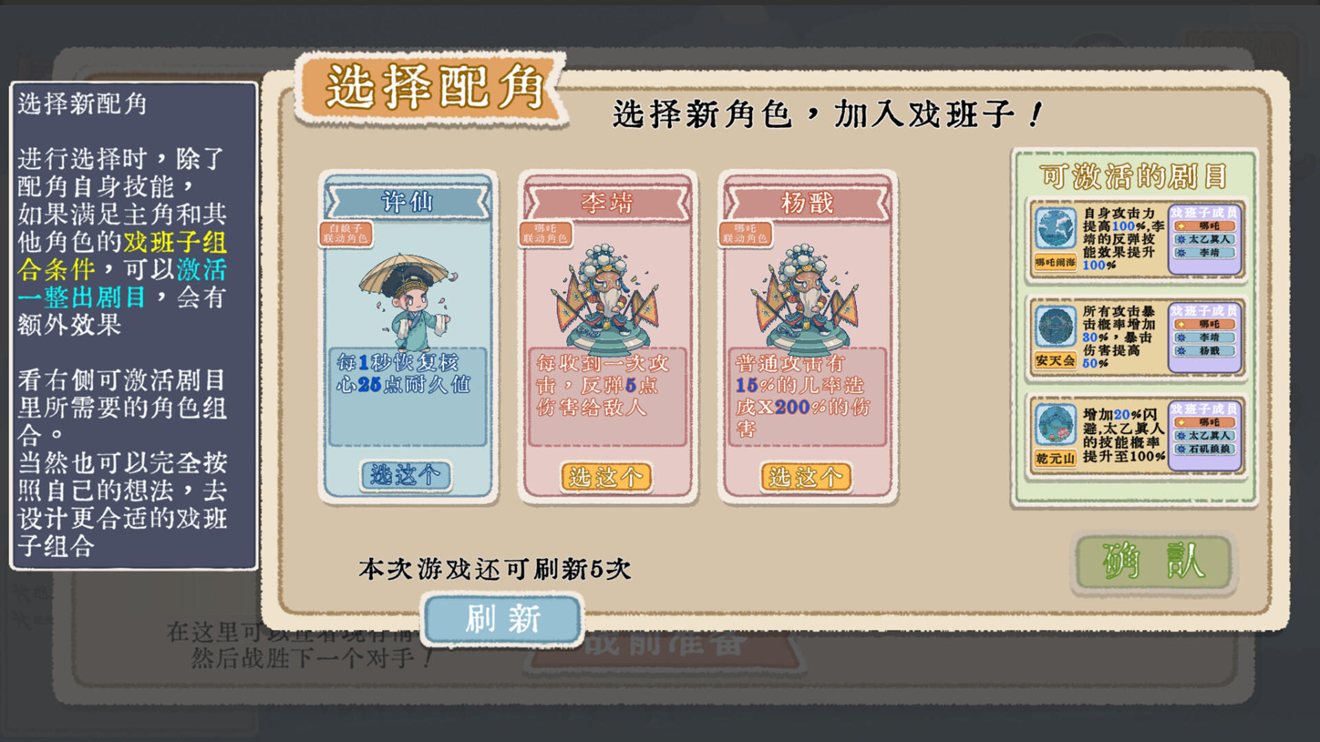 《出将入相》是一款自动战斗的肉鸽游戏,玩家将在游戏中扮演一位小班底的戏剧组长,随着家庭和大环境的没落,戏剧也越来越难混,但男主立志想要在全国最大的舞台中表演自己,创造一个翻身的机会,于是男主将带领他的小班底从底层开始一路打到最高舞台,并且赢下比赛的话就算通关。