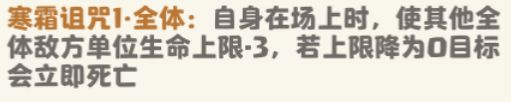 小tip:该技能将在诅咒巫妖达到3级和5级时,升级为寒霜诅咒2和寒霜诅咒3,降低敌方单位的生命上限提升至4点和5点。