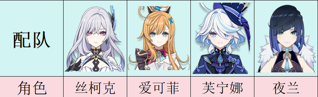 或者,直接丝柯克冰水战舰,丝柯克、爱可菲、芙宁娜、行秋(夜兰)。当然,其他的双元素变种都行,比如,火神超载队,火神、伊安珊、欧洛仑、夏沃蕾都行。