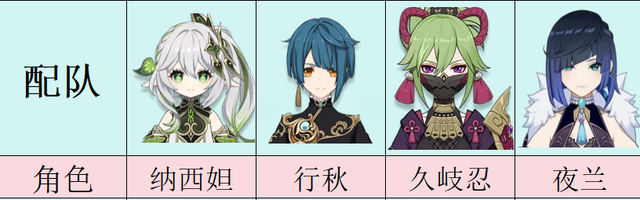 其次就是草神、伊涅芙、爱诺、久岐忍,这个队伍可变性很强,久岐忍可以换龙王、行秋都行,拾柒实测过都比较好用。