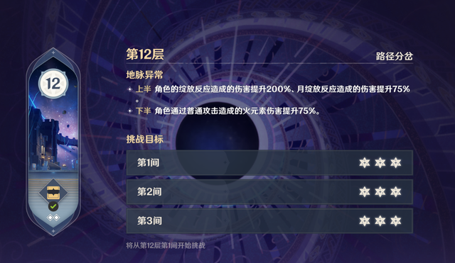 12层上半的地脉异常,给的是绽放和月绽放伤害提升,这一看就是,策划鼓励大家玩奈芙尔队,12层下半的地脉异常,给的是角色普攻造成的火伤提升75%。