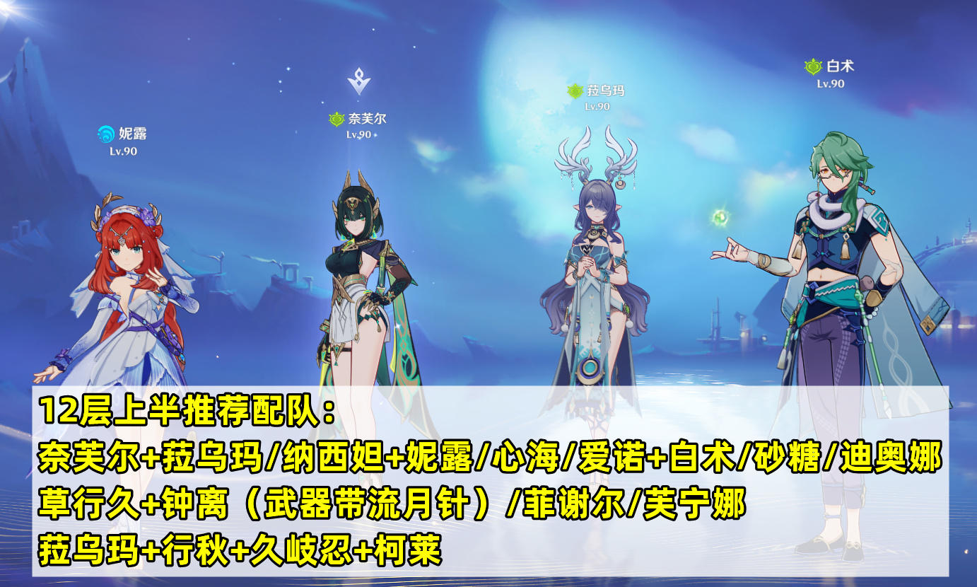 【配队推荐和总结】12层上半因为有岩居蟹,因此最好还是用绽放队;另外还要考虑到天马boss的破盾。推荐配队有:奈芙尔+菈乌玛/纳西妲+妮露/心海/爱诺+白术/砂糖/迪奥娜、草行久+钟离(武器带流月针)/菲谢尔/芙宁娜、菈乌玛+行秋+久岐忍+柯莱。