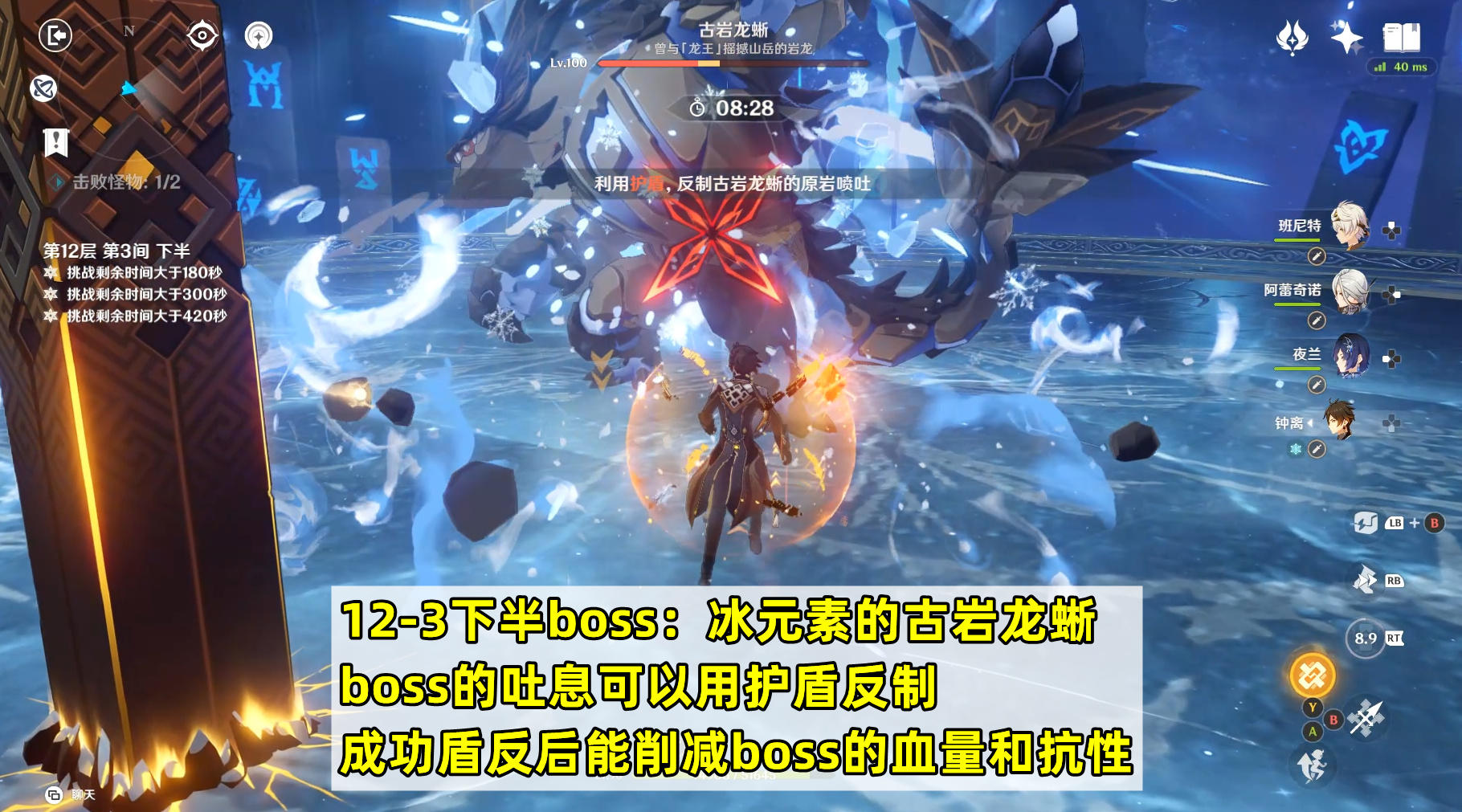 第三间boss是冰元素的古岩龙蜥,常态岩抗和冰抗较高。古岩龙蜥的吐息可以用护盾反制,成功盾反后能削减boss的血量和抗性。