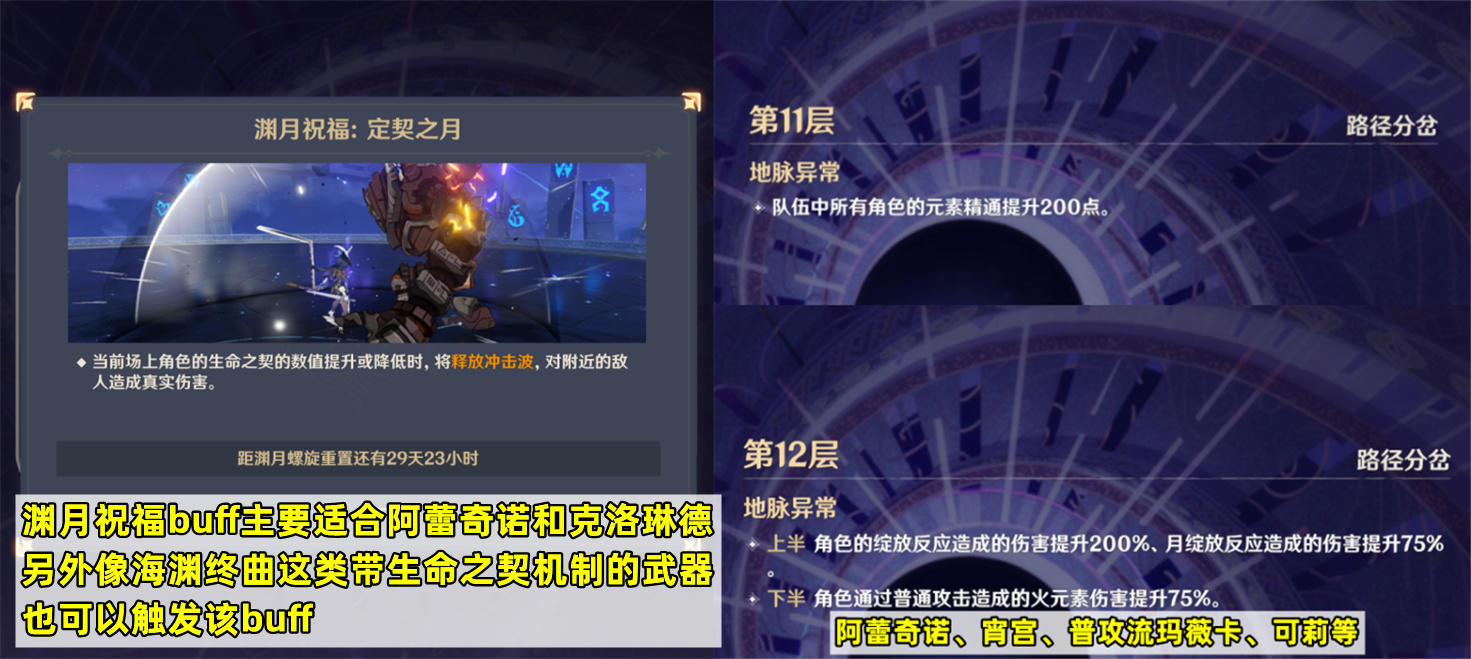 【buff分析和适用角色】渊月祝福是场上角色生命之契提升或降低时,造成额外范围伤害。主要适合阿蕾奇诺和克洛琳德,另外像海渊终曲这类带生命之契机制的武器,也可以触发该buff。然后是地脉异常buff,11层是全队精通提升200点。12层上半是绽放和月绽放反应增伤;下半是普攻火伤提升,适合阿蕾奇诺、宵宫、普攻流玛薇卡、可莉等等。