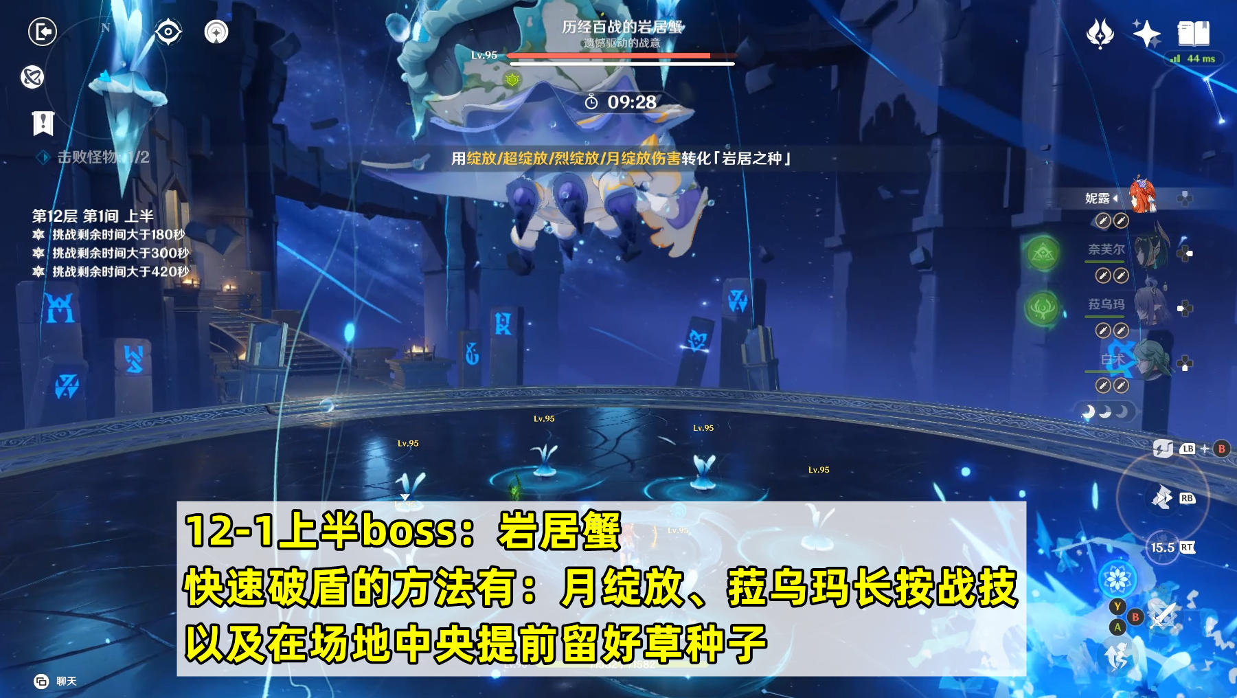 然后是12层,先来说上半:第一间boss是岩居蟹,需要绽放相关反应破盾。快速破盾的方法有:月绽放、菈乌玛长按战技、以及在场地中央提前留好草种子。