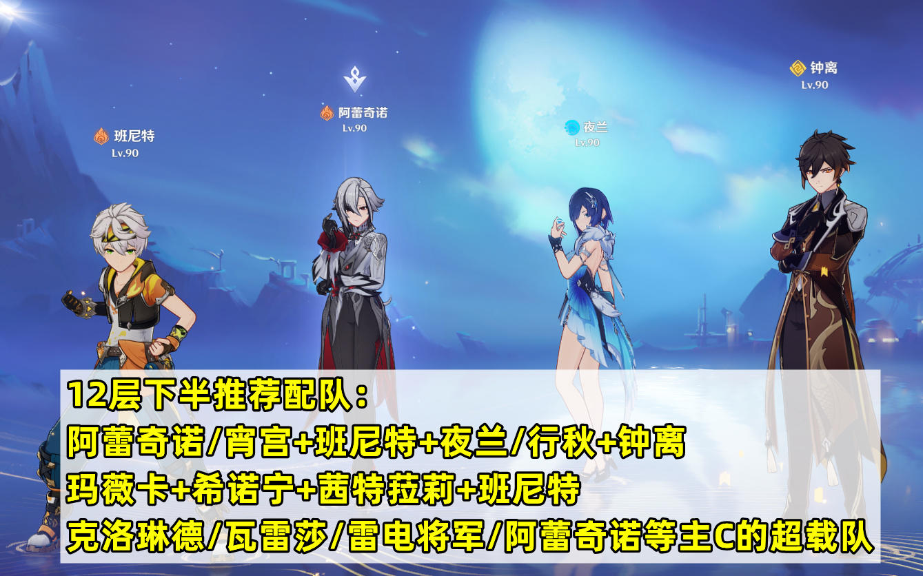 下半推荐带有火元素角色的配队,比较推荐的队伍有:阿蕾奇诺/宵宫+班尼特+夜兰/行秋+钟离、玛薇卡+希诺宁+茜特菈莉+班尼特、克洛琳德/瓦雷莎/雷电将军/阿蕾奇诺等主C的超载队;等等。