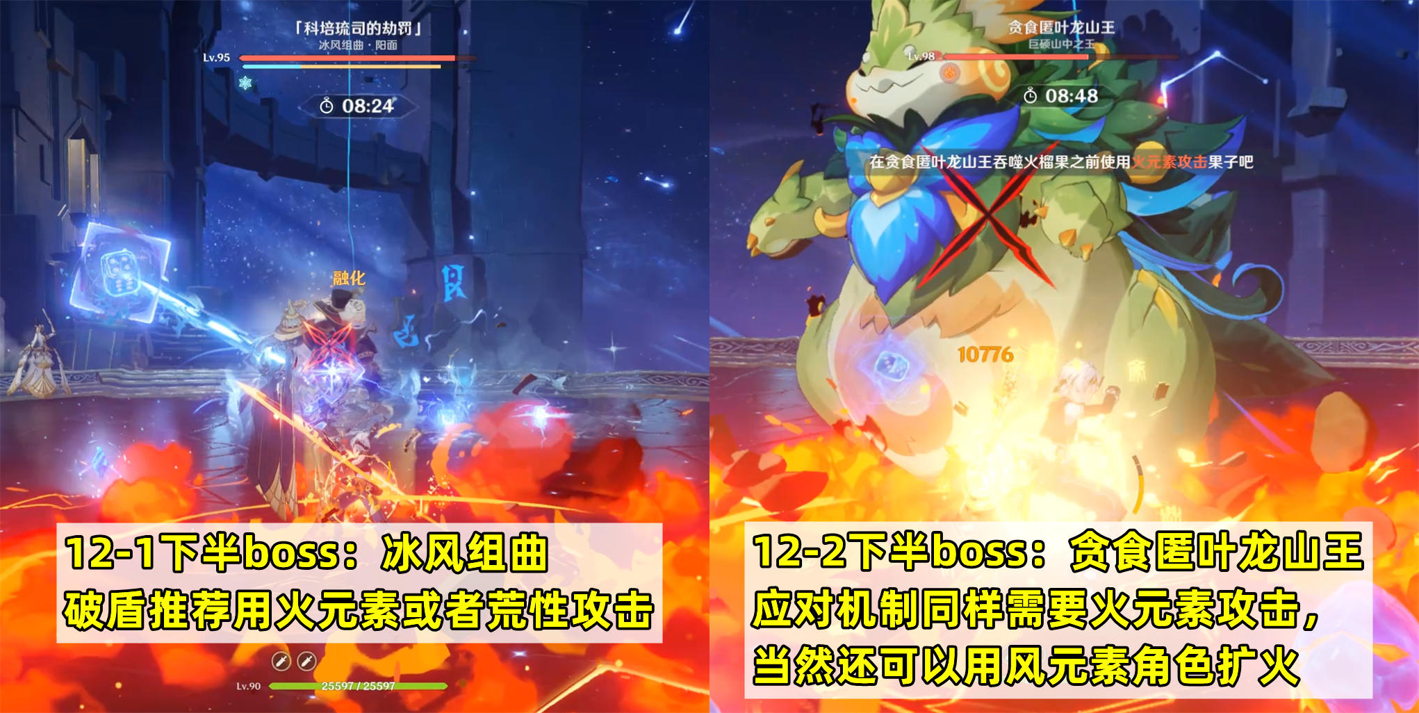 下半第一间boss是冰风组曲,破盾推荐用火元素或者荒性攻击;第二间boss是贪食匿叶龙山王,应对机制同样需要火元素攻击,当然还可以用风元素角色扩火。
