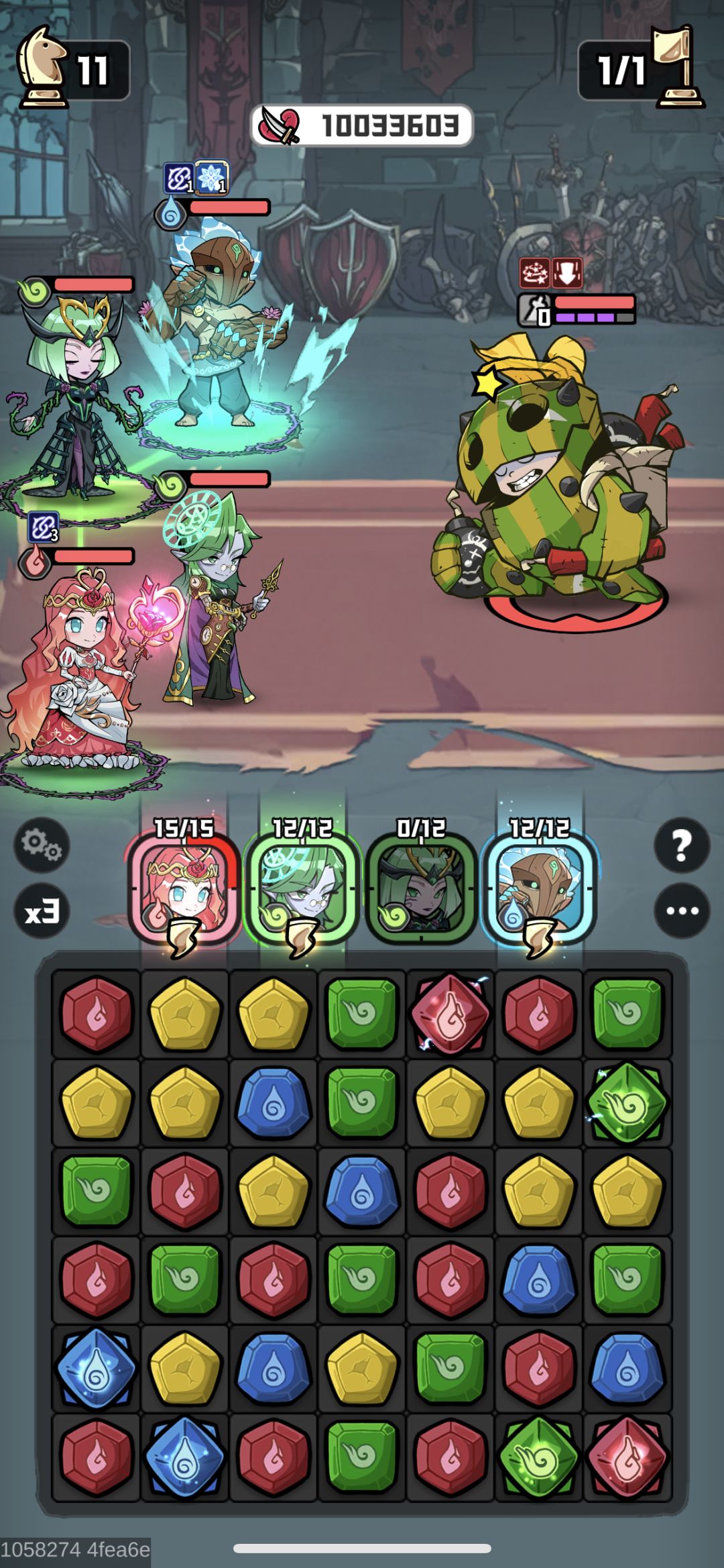 5.15回合到1回合:15、12、9、6回合都在棋盘生成树桩,树桩出来后,观察树桩四周的颜色,用大宝剑消,重复上述技能,保持菲雅连伊芙琳和班扬,直至大宝剑用完。最后就看自己的消消技巧和运气了,尽量先消绿色拼眩晕概率,没有只能专心搞输出了,10M达成。