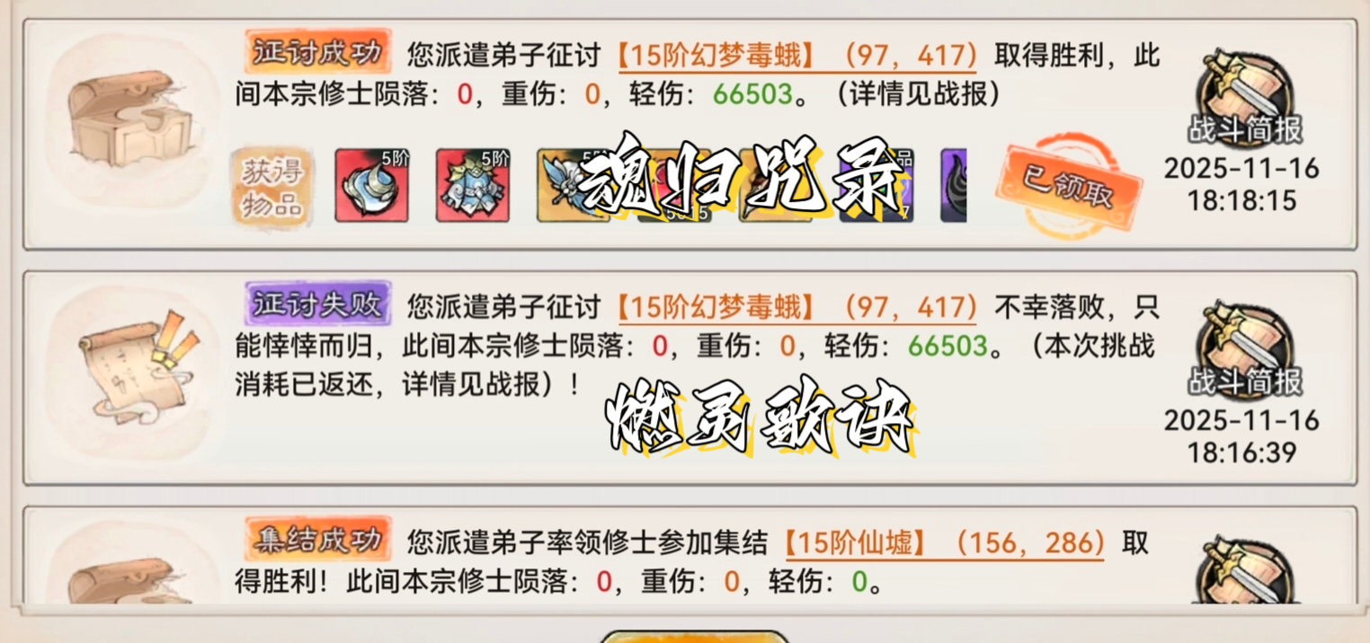 出于对[燃灵歌诀]可以清除减益状态的考虑,up主分别进行了两次测试(唐蝶衣携带燃灵歌诀或魂归咒录),发现携带[魂归咒录]的两次都胜利了,携带[燃灵歌诀]的两次都失败了,因此up主还是推荐唐蝶衣携带[魂归咒录]而不是[燃灵歌诀]。