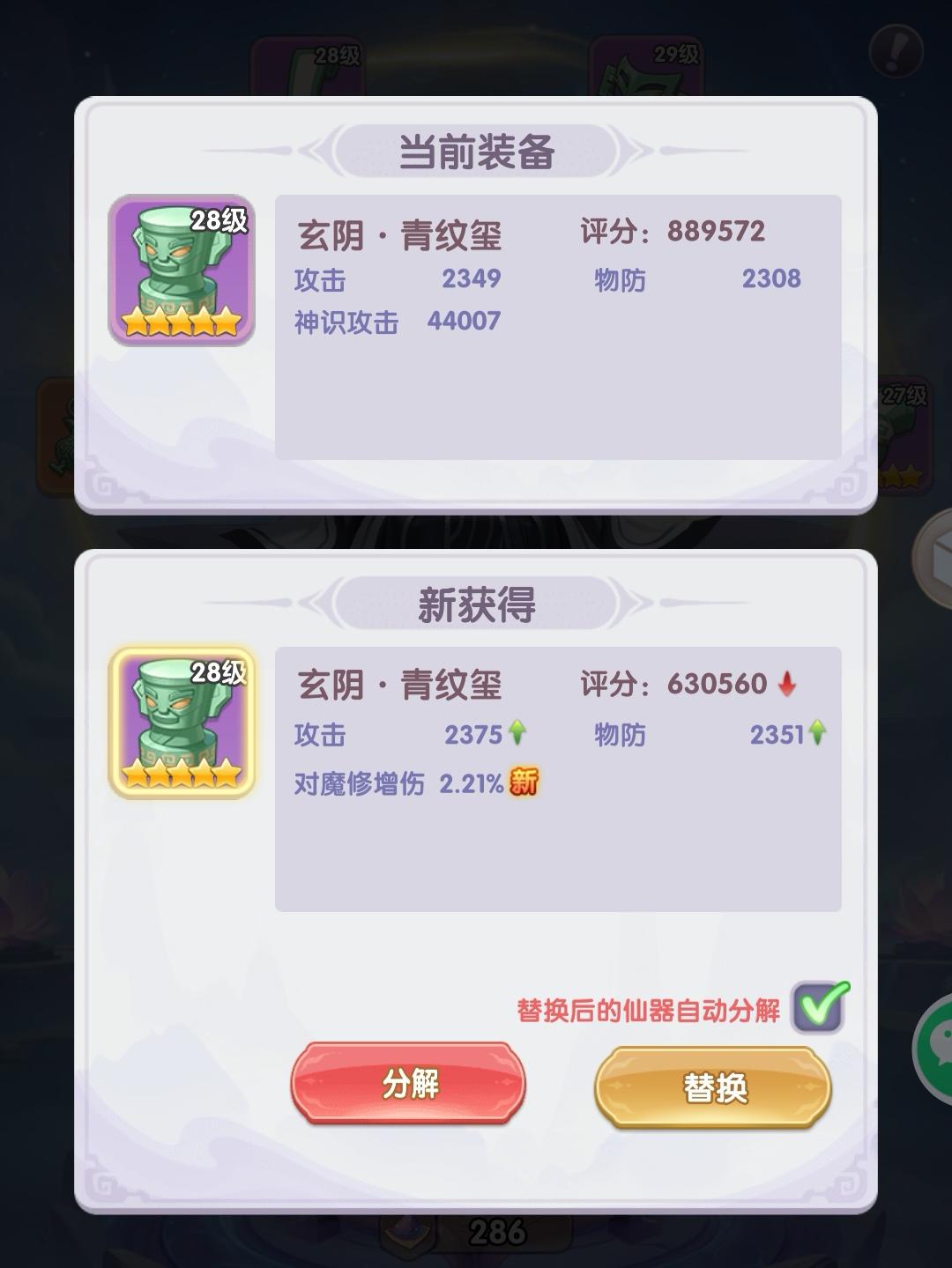 2.锻造仙器,会有提示不管高于或低于目前仙器的,这时要认真看下装备有无带最主要的特殊属性,有就替换了,没有分解。这种方法慢点,但是可以过滤出很多好装备,不然全被分解了。但是,注意注意注意,在看属性时,一定要注意不要把身上的好仙器替换分解了,一定注意,这是非常关键的,不然后悔莫及。