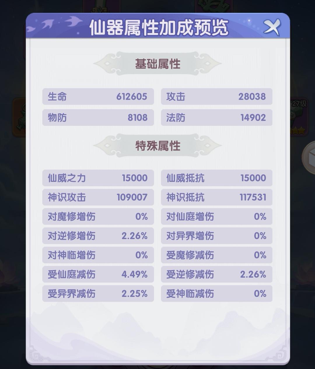 仙器的特殊属性:仙器分为基础属性,星级越高基础属性越高。而仙器的特殊属性,是随机的出的。最主要特殊属性:神识攻击,神识抵抗,仙威抵抗,仙威之力。这里我把这4项称为最主要的特殊属性。