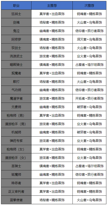 为方便大家选择哪套装备进行毕业,笔者这里给大家做了个全职业的推荐表格: