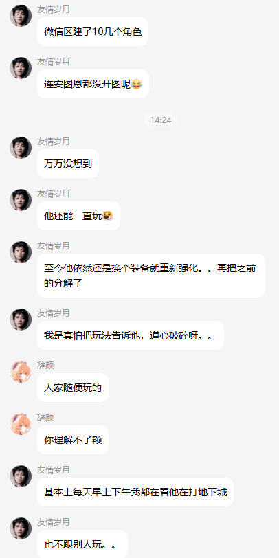 比较可爱的有一个地方,那就是每次出了新的更强的装备,他都要把之前的装备分解掉,然后重新强化,团本都没打过,按这样的玩法能从开服玩到现在,每天坚持搬砖,这份执着是真爱无疑了