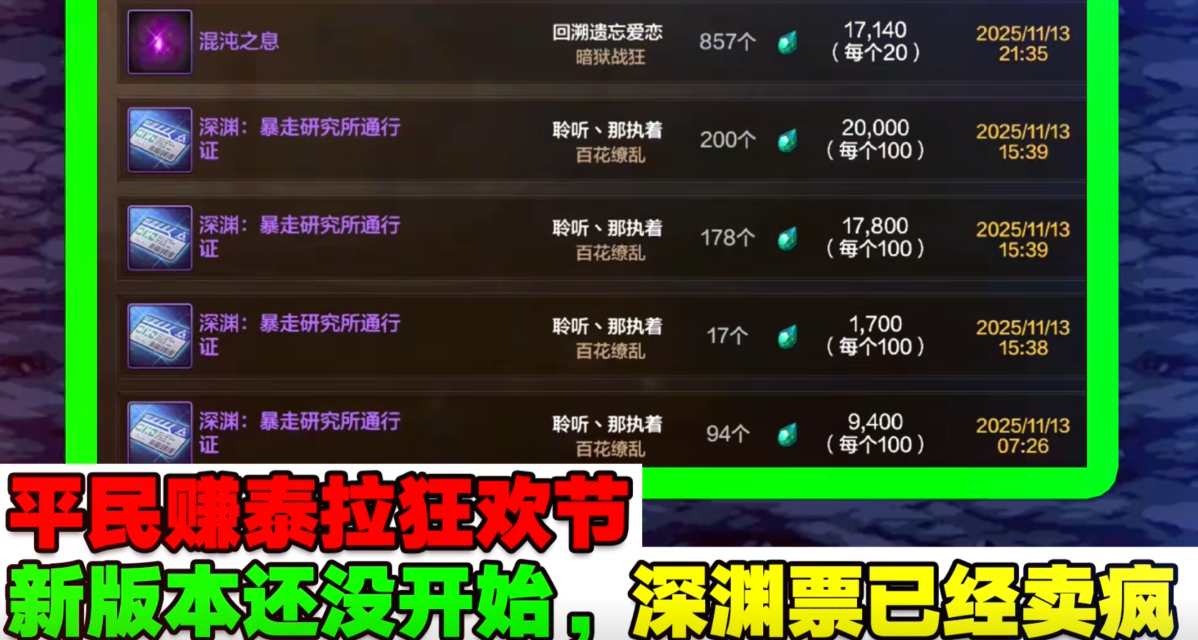 由于新版本要开放全新深渊,深渊票也是由老版研究所通行证兑换,所以有不少氪金玩家开始发力,大量购买老版深渊票,因为新版本装备A升B的材料都是账绑的,也就是角色越多大号毕业速度也就越快,所以现在的深渊票是很容易卖出去的,这就有不少玩家看到这一商机,开始上架深渊票了,甚至已经赚够了一轮犬夜叉联动