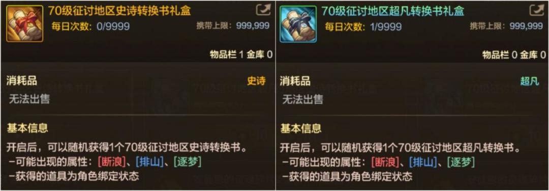 今天为大家呈现的内容,主要对“70级征讨地区史诗/超凡转换书”和“70级征讨地区史诗装备技能定制自选变更券”这两个部分做详细介绍。