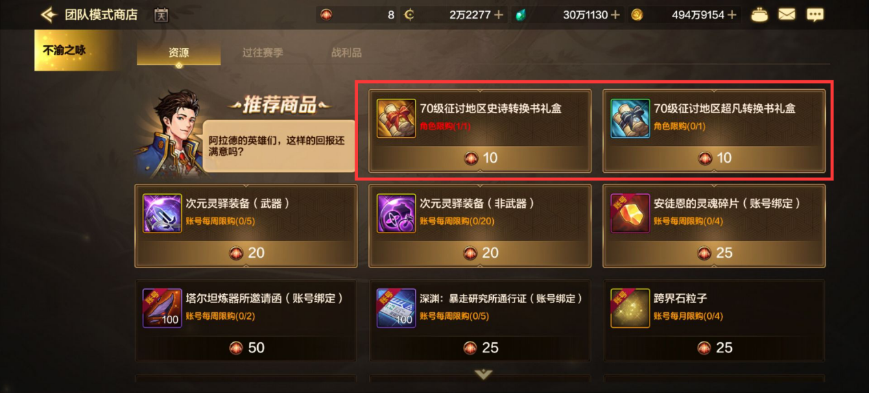 使用“70级征讨地区史诗/超凡转换书”可将身上的70级史诗装备转换为特化装备,在团队模式商店当中,每个角色可以限购1个70级征讨地区史诗转换书礼盒和1个70级征讨地区超凡转换书礼盒。