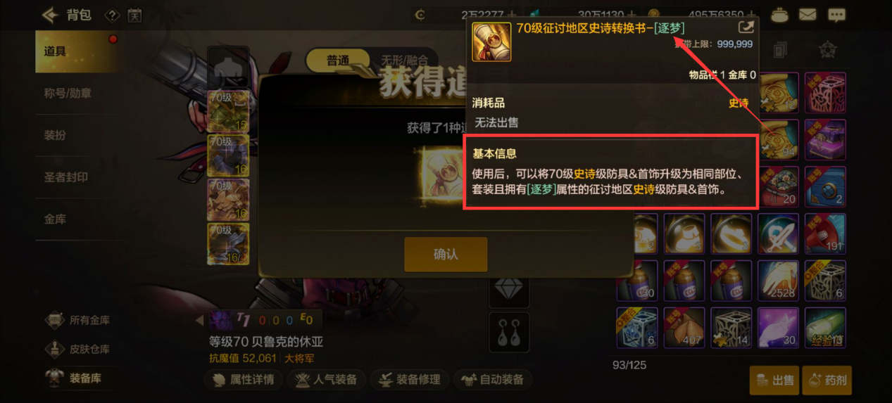 转换书的作用是可将70级常规史诗防具/首饰,转换为特化装备,但要注意一点,礼盒开启后,将从[断浪][排山][逐梦]3种随机获取一种。