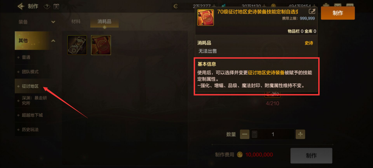 在制作功能当中,我们可以通过材料合成,来获得70级征讨地区史诗装备技能定制自选变更券,可将现有特化词条转换为想要的特化属性。