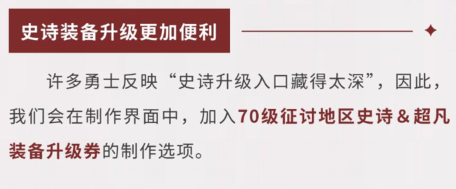 除了上边提到的“史诗/超凡转换书”,在制作功能当中也将加入“70级征讨地区史诗&超凡装备升级券”的制作项,预计消耗材料依旧是征讨之地掉落材料。