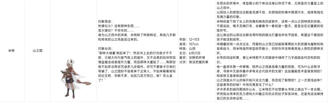 作为山之国的几位伙伴中最有反差感的一位,米特的档案也很有反差色彩。