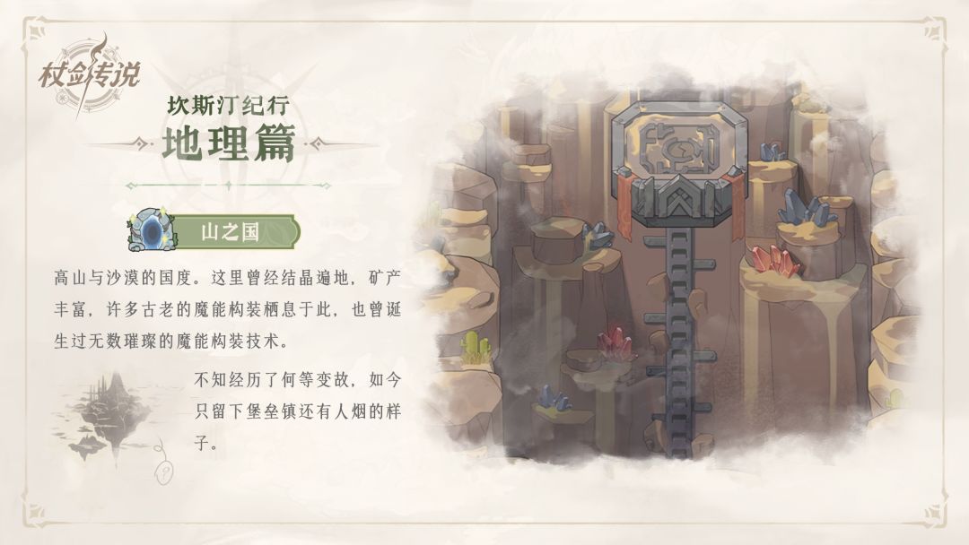 山之国拥有众多活跃的火山和大片的荒漠,熔岩在山谷间流淌。这里罕有人迹,但坚韧不拔的山民一族在这等险恶之地发现了巨大的财富——魔能邃渊,一个蕴藏着无数魔能矿石的矿坑。巨大的利益让古代的山民们决定在山之国中扎根下来。