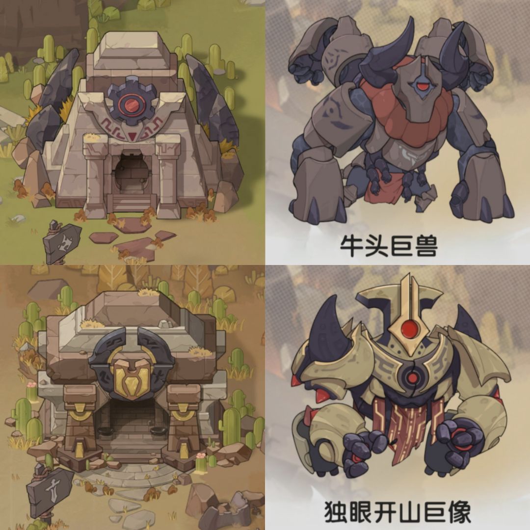 牛头巨兽和神庙遗迹的风格统一,开山巨像和古代石堡的风格统一,于是我就产生了一个大胆的推测——山之国的两种魔能构装体和遗迹风格分别分属两派,而山之国过去的魔能暴动其实是基于内部矛盾引起的内乱……