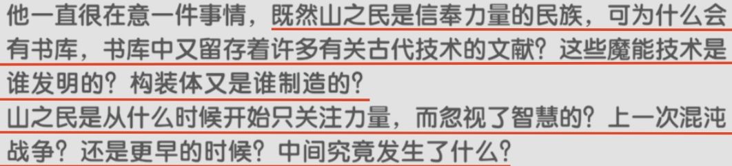 而后面谈到的山民哦书库,古代技术文献,魔能技术以及构装体,这些内容其实基本都是自问自答了,米特在下一段直接给出了答案,确定了这些东西大概都是山民过去的造物。忽视智慧这个说法就是已经基本确定了这些东西都源于古代山之国,或者和山民的过去有极大的渊源。