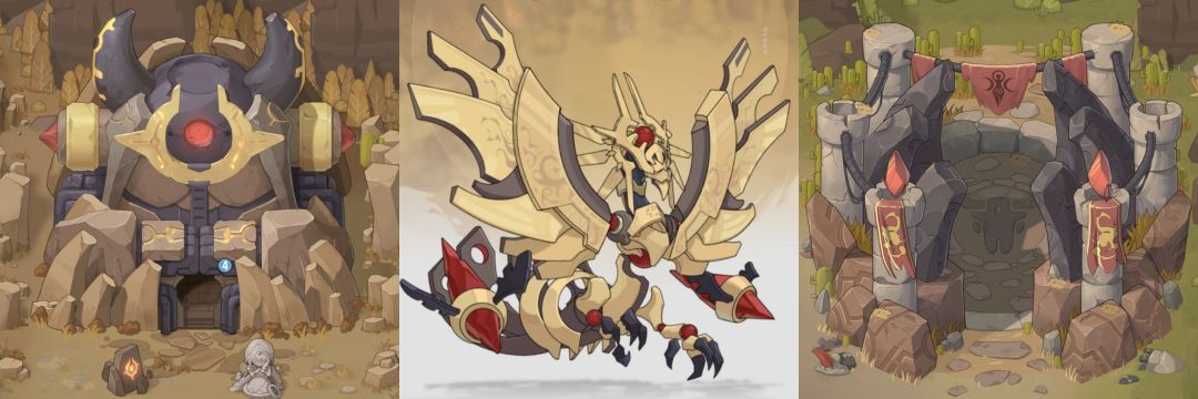 机神山和上面两个建筑的风格又有所不同,机神山的风格略微有些接近开山巨像和烈焰凤凰,但和另外两个建筑的细节很难对上。