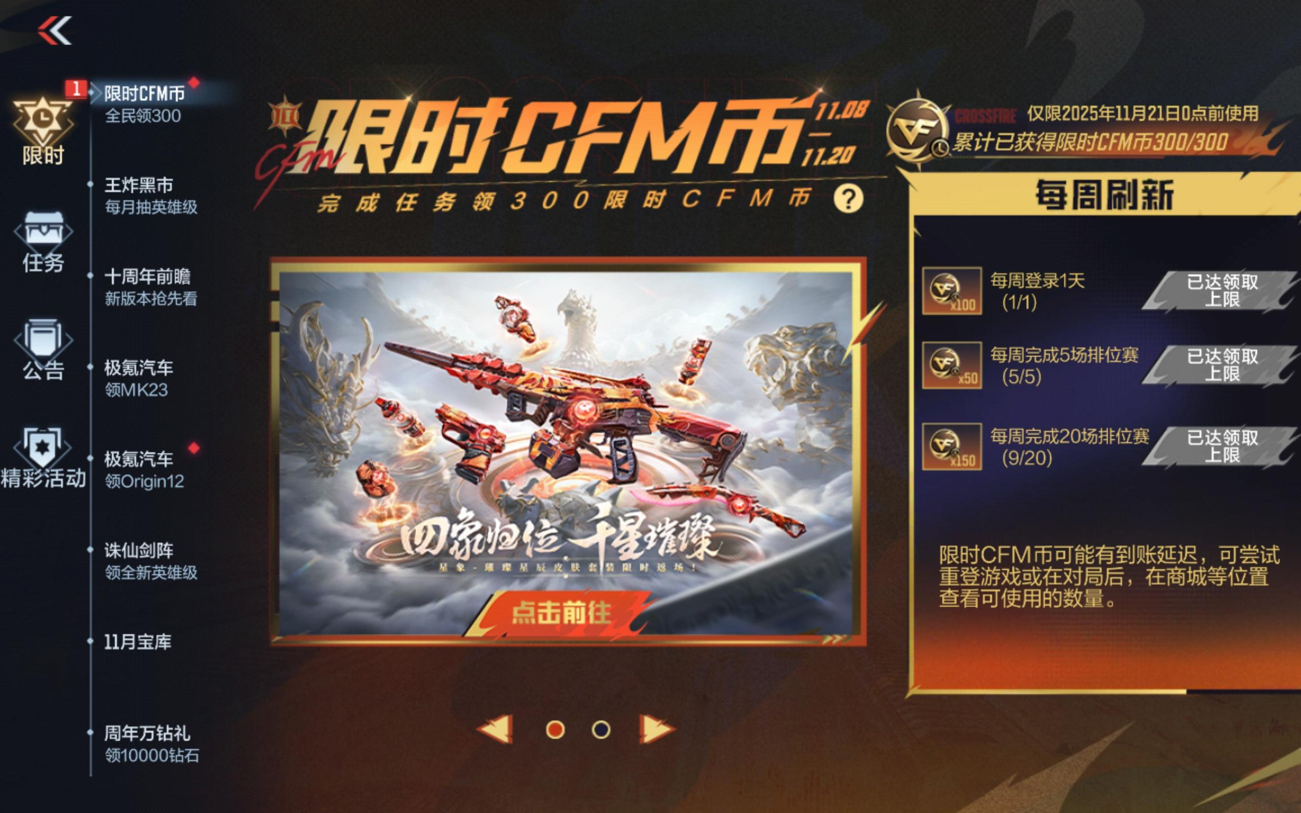 十周年限时CFM币福利火力全开,活动期间完成每日基础任务即可攒币。限时CFM币可兑换商城指定武器、购买赏金令等级,还能参与星象夺宝、诸神黄昏夺宝,多场景使用,千万不要错过哦!