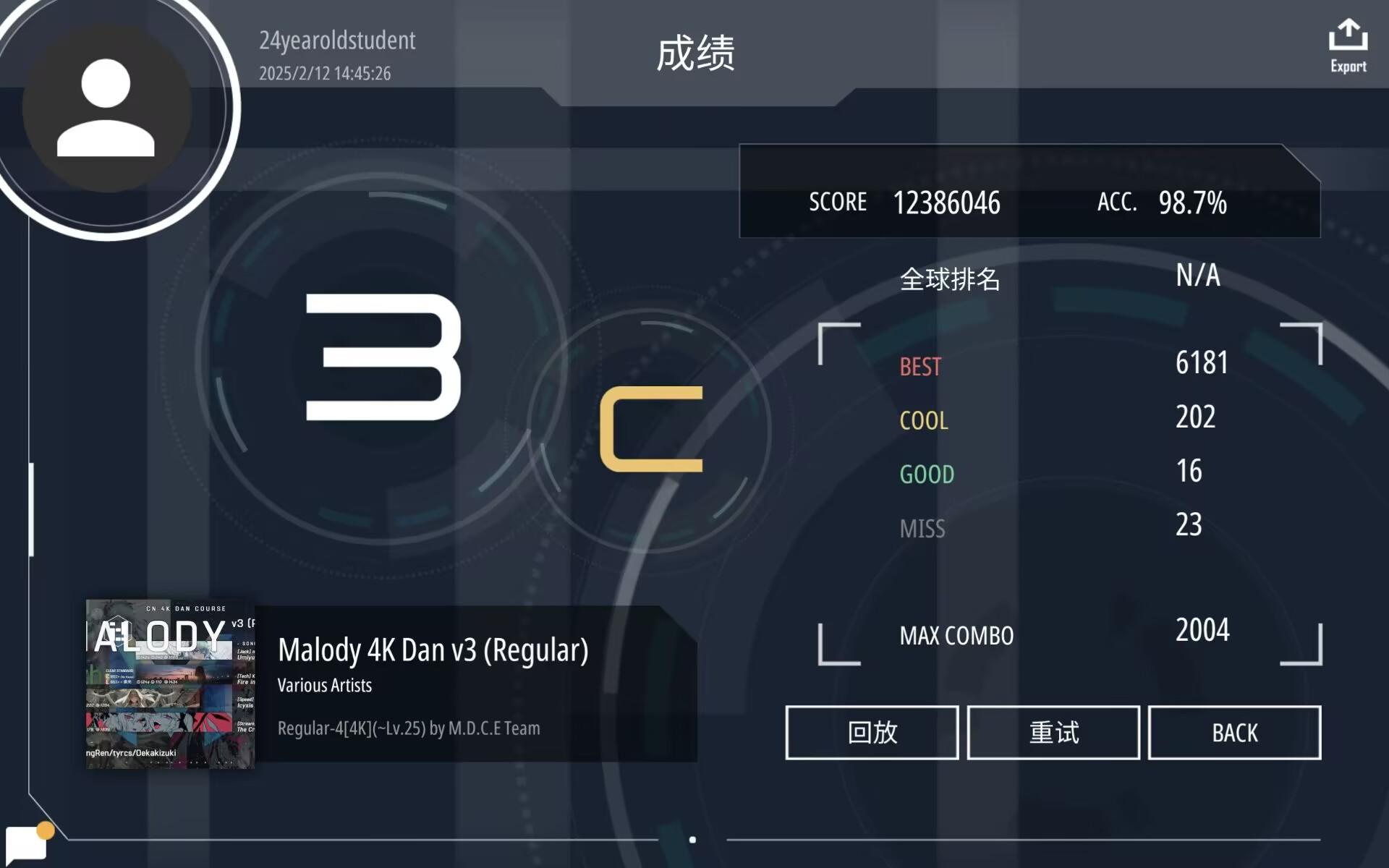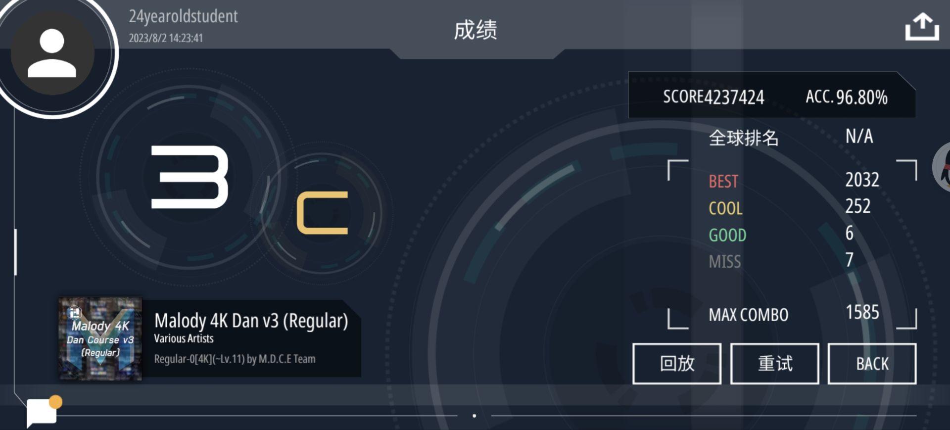 2023.8.2,我了解到了Malody的4k段位,便下载来开始练习。由于我当时已有一定音游基础,所以连着过了0-3dan。