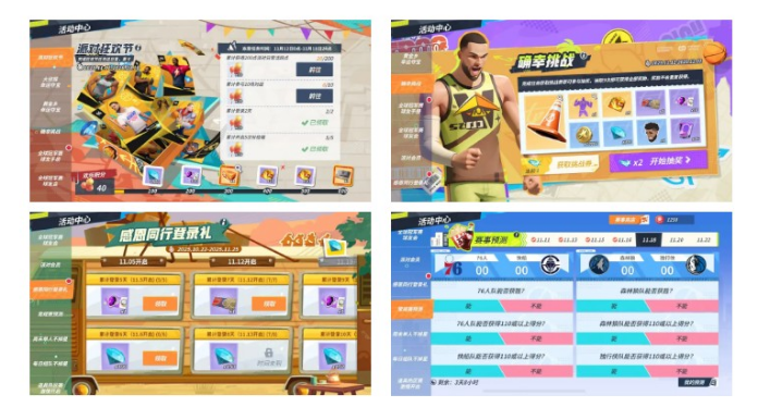 说了这么多新活动预告,大家也别错过了游戏里正在进行的福利活动呀!免费送橙卡巨星、黑卡的[派对狂欢节]、拿免费时装、庆祝动作的[确幸挑战]、累计登录拿培养道具的[感恩同行登录礼]......让你的球星培养快人一步,早日点满天赋。
