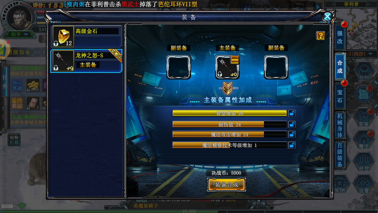 - 装备合成:3 件同类型、同品质(蓝 / 金)装备可合成新装备,属性随机生成,可用金石、魔石替代缺失装备,每次合成需支付少量决战币作为手续费。