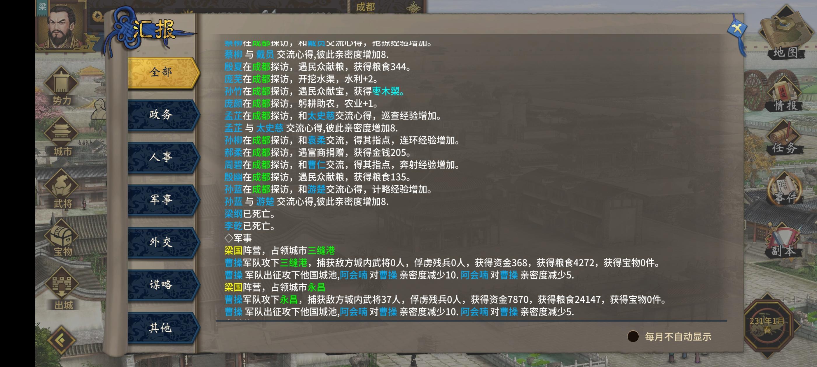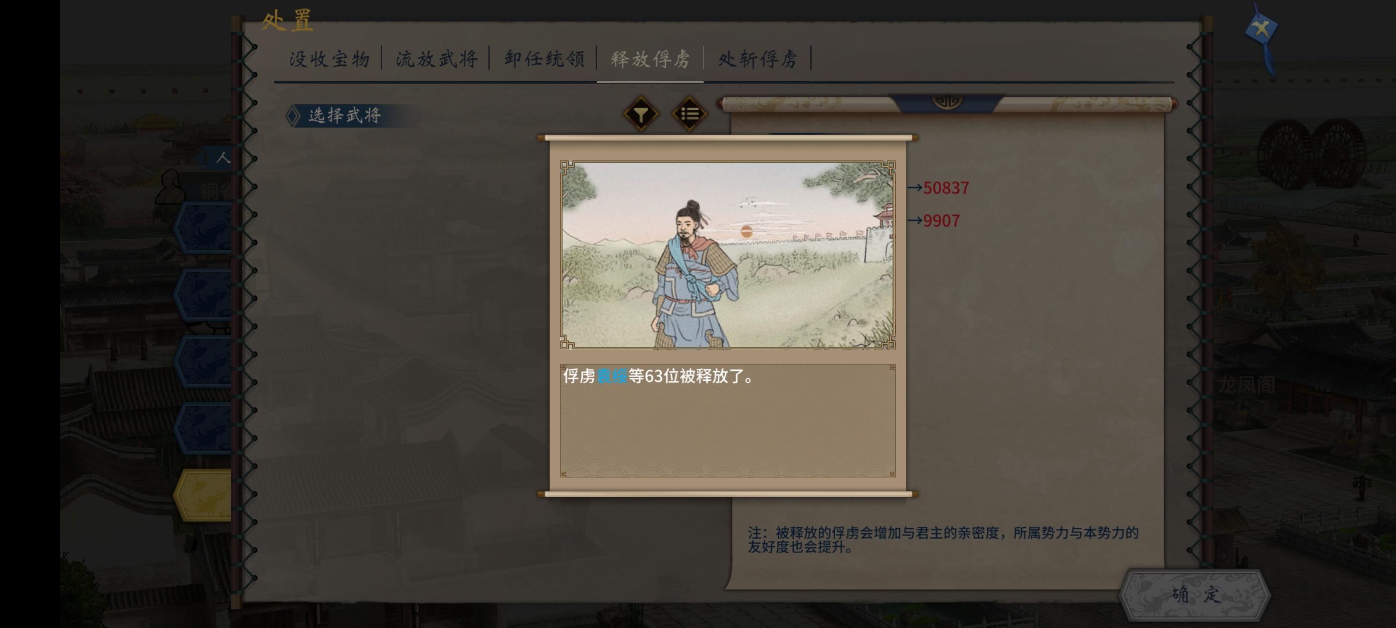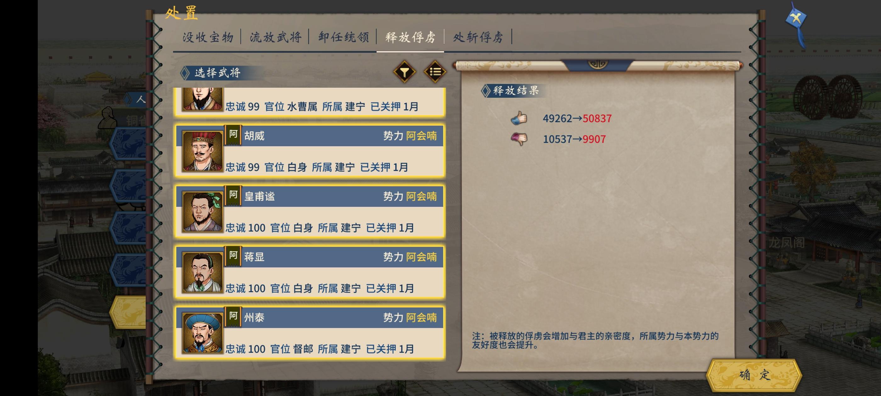 你是否因为不统一而四处受灾,或是因为做坏事而来的恶名没法消?其实给电脑留两个距离近的城就可以了(我暂时把这里划给了他)。然后攻下他的都城,一下子就俘虏几十个武将(放了就降恶名)。