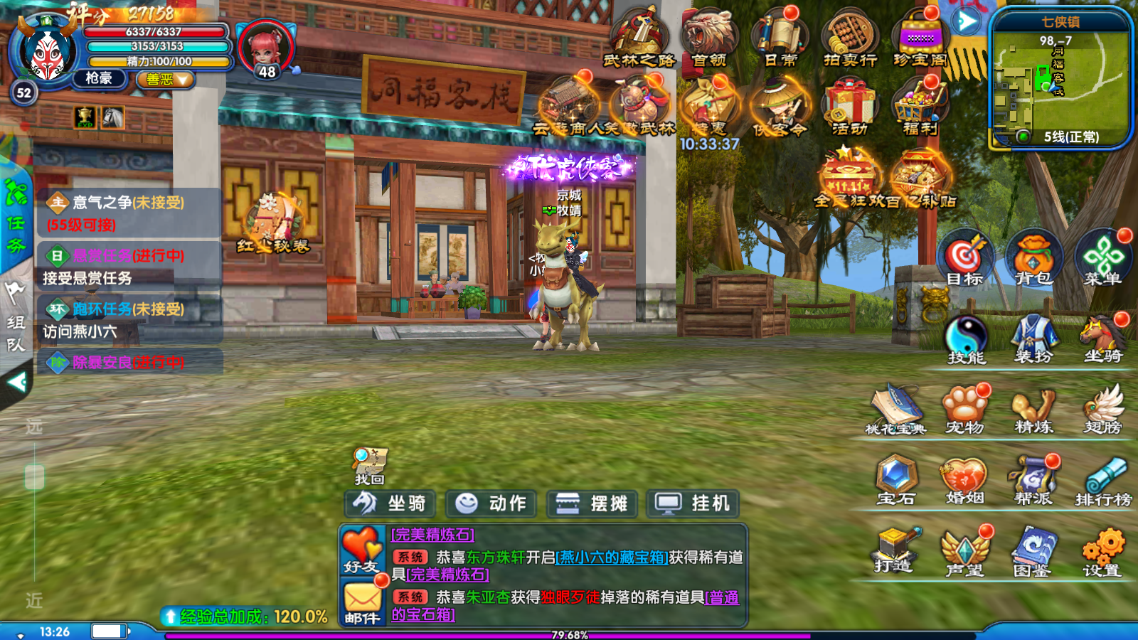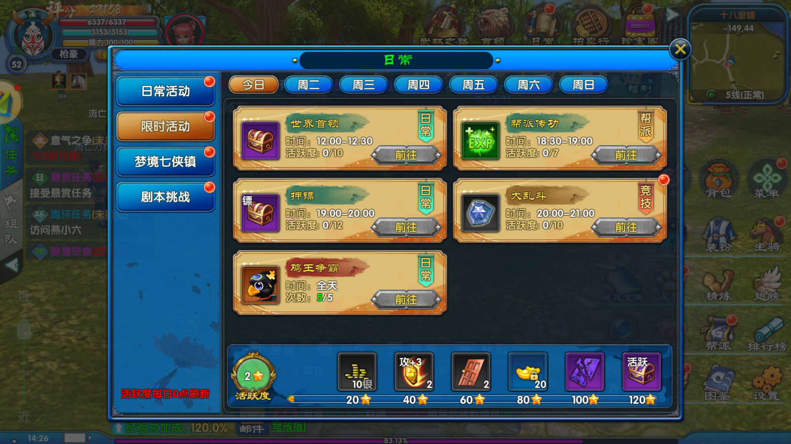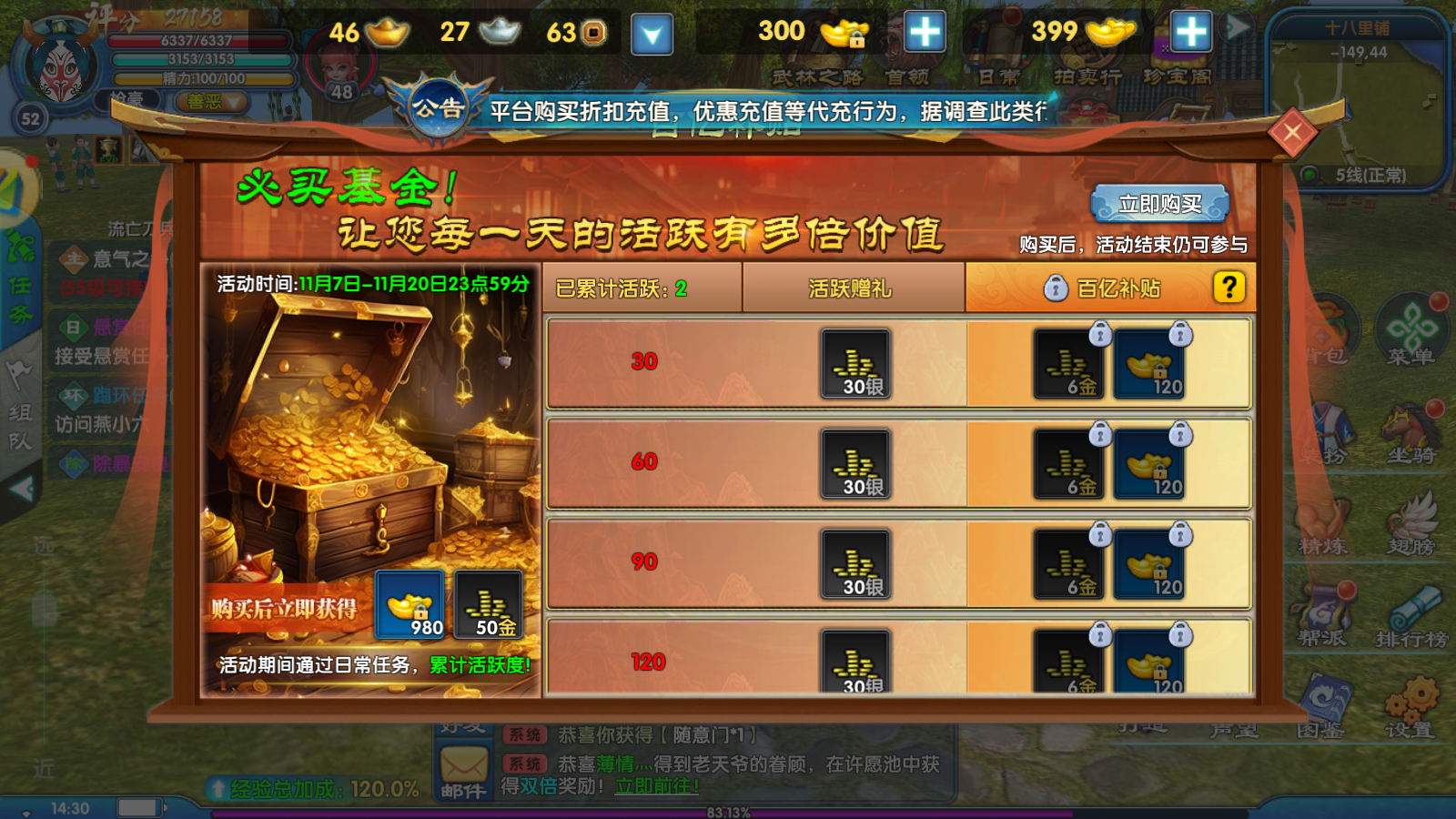- 免费福利:参与日常(押镖、副本)、限时(鸡王争霸、夜之七侠镇)活动累加活跃度,免费领精炼石、经验符、兽神精魄;