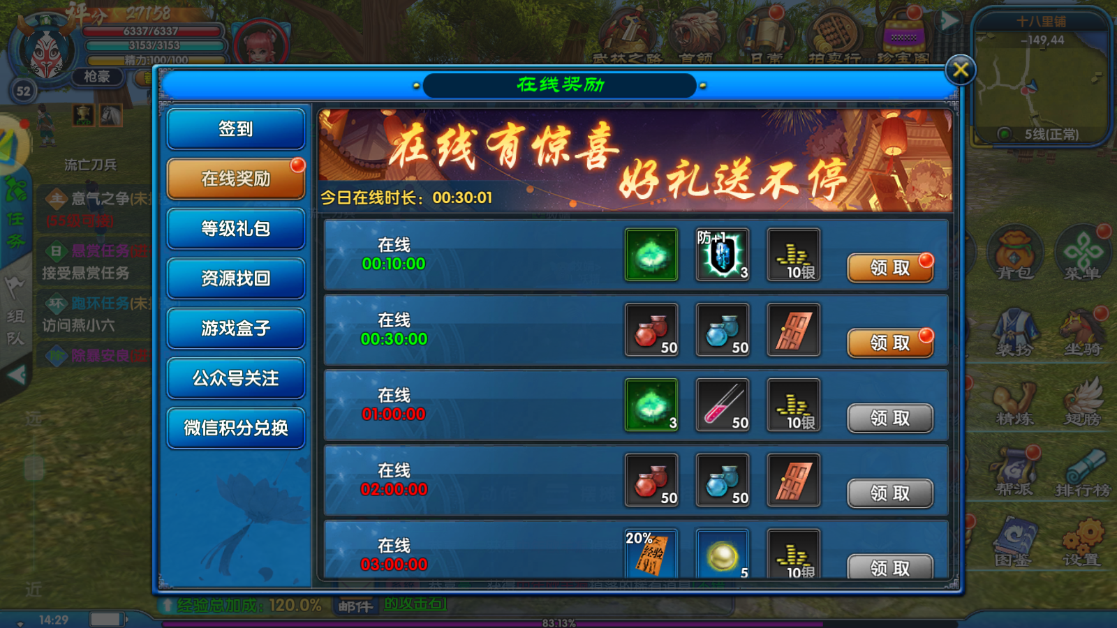 - 在线奖励:累计在线解锁精力道具、传送符、双倍经验符,助力高效冲级;