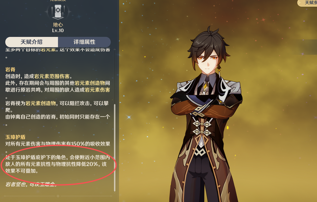 同时,元素战技的持盾期间,还多了减少附近敌人“20%的全元素抗性和物理抗性”的效果,就此“人权卡”钟离才算是正式登场。