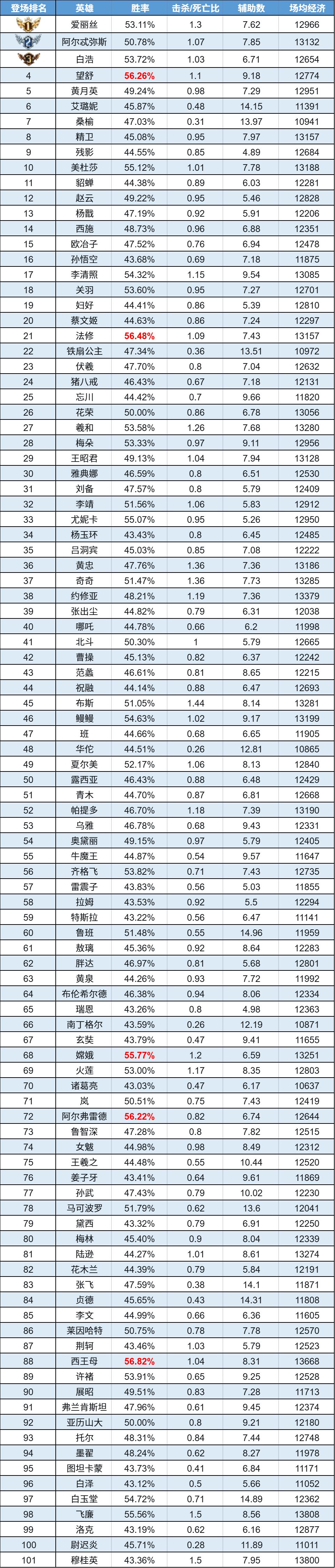 排序:按登场率高低排序,标红为胜率前5