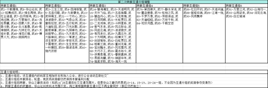 4、跨服互通后的武盟战、华山论剑类玩法范围不变,闯江湖根据跨服互通分区不再全服同步(新区仍然独立)