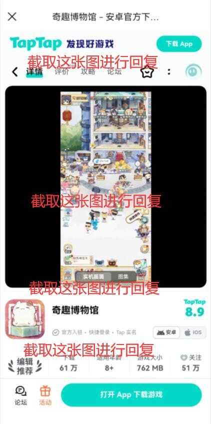 3、跳转到【奇趣博物馆】游戏详情页面后进行截图,用该截图在评论区回复即成功参与。