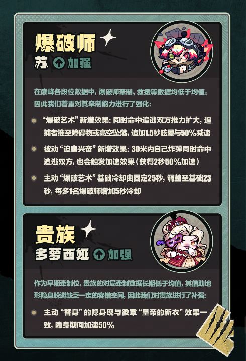 11月20日(周四)更新维护后,“逃出惊魂夜”将迎来新赛季版本改动!我们对部分角色进行了适当补强,以提升其在当下版本的适应能力,详细调整内容戳图查看~