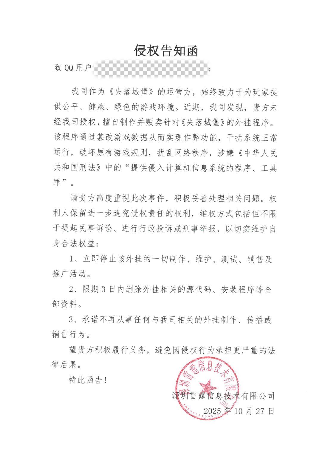 对此,我们已向侵权人正式发出侵权告知函,要求其立即停止一切外挂的制作、销售及传播行为,并限期删除相关程序及代码。我们保留通过法律途径进一步追究其责任的权利,包括但不限于提起民事诉讼、行政投诉或刑事举报。