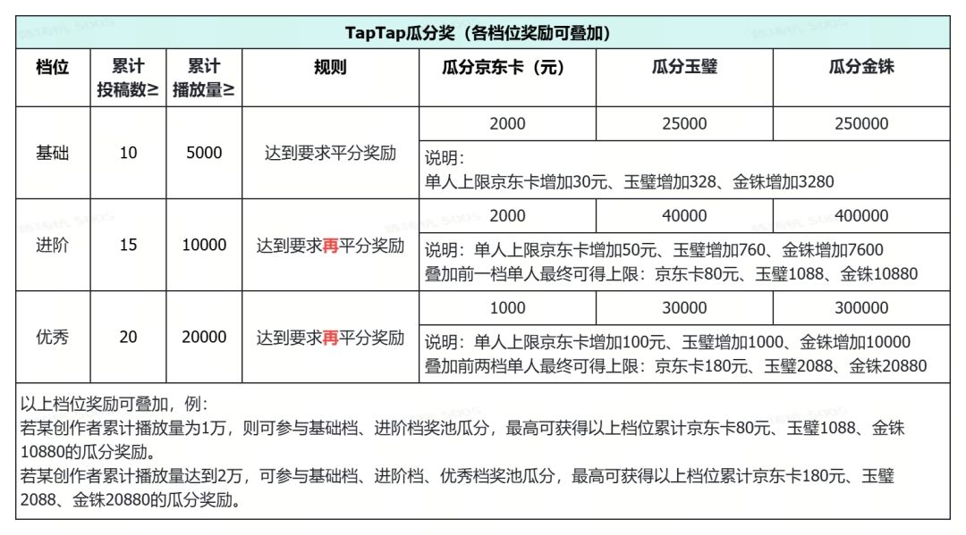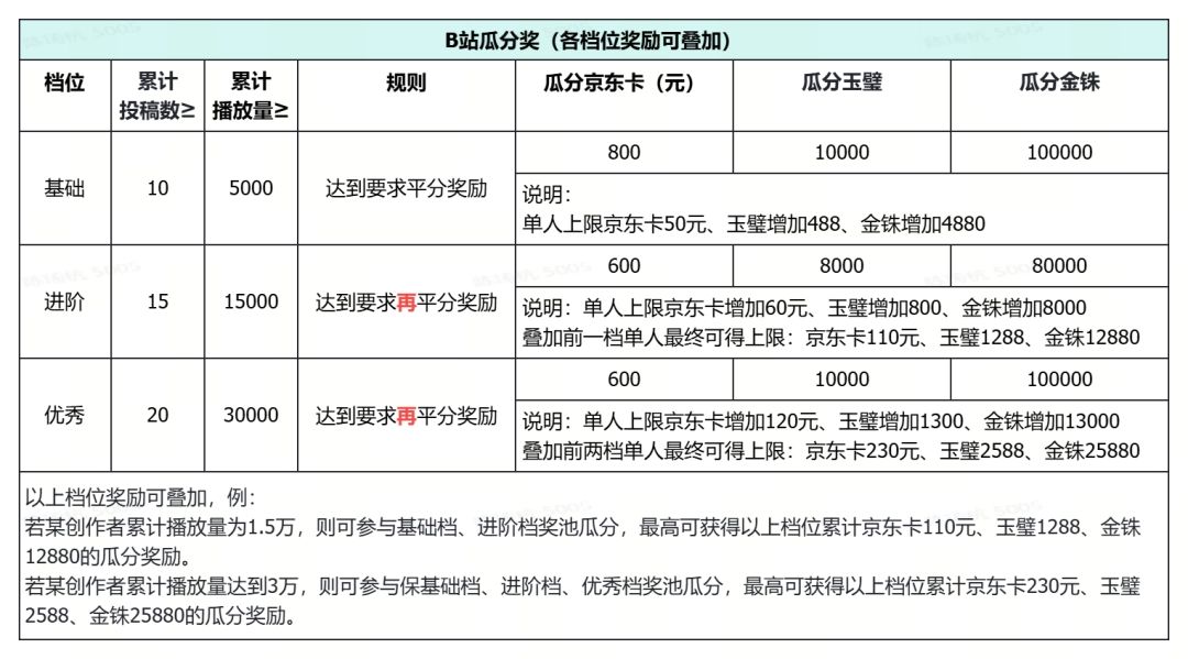 围绕《新三国志曹操传》进行游戏攻略内容分享,在活动期间累计投稿和累计播放到达相应档位,解锁相应京东卡奖励和游戏扶持礼包,多个档位的奖励可进行叠加。