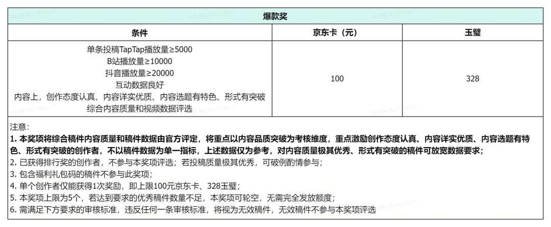 注意:上述所有游戏礼包基于鼓励和扶持投稿的原则特别设定,禁止创作者通过水稿和刷量等恶意行为换取礼包,一经发现将不予发放奖励,多次水稿的创作者将取消本月活动所有奖项资格。游戏礼包将发放至创作者本人使用的游戏账号,禁止他用。