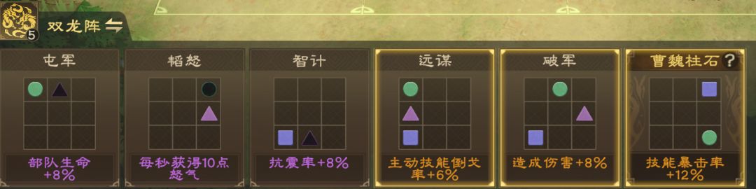 佐谋之才:提升副将抗震率,降低副将爆发技能时被反震的伤害;