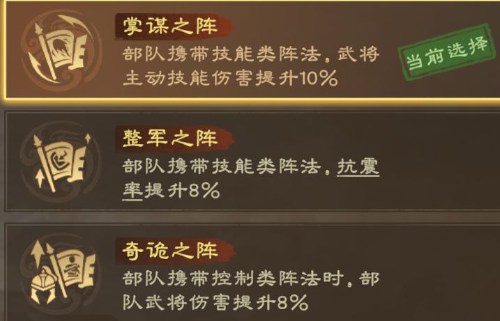 曹仁天赋如下,由于携带技能阵法,选择“整军之阵”。