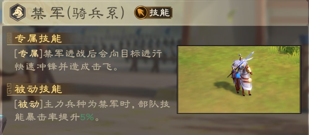 兵种上推荐使用骑兵系的禁军,最大程度发挥主动技能伤害能力。