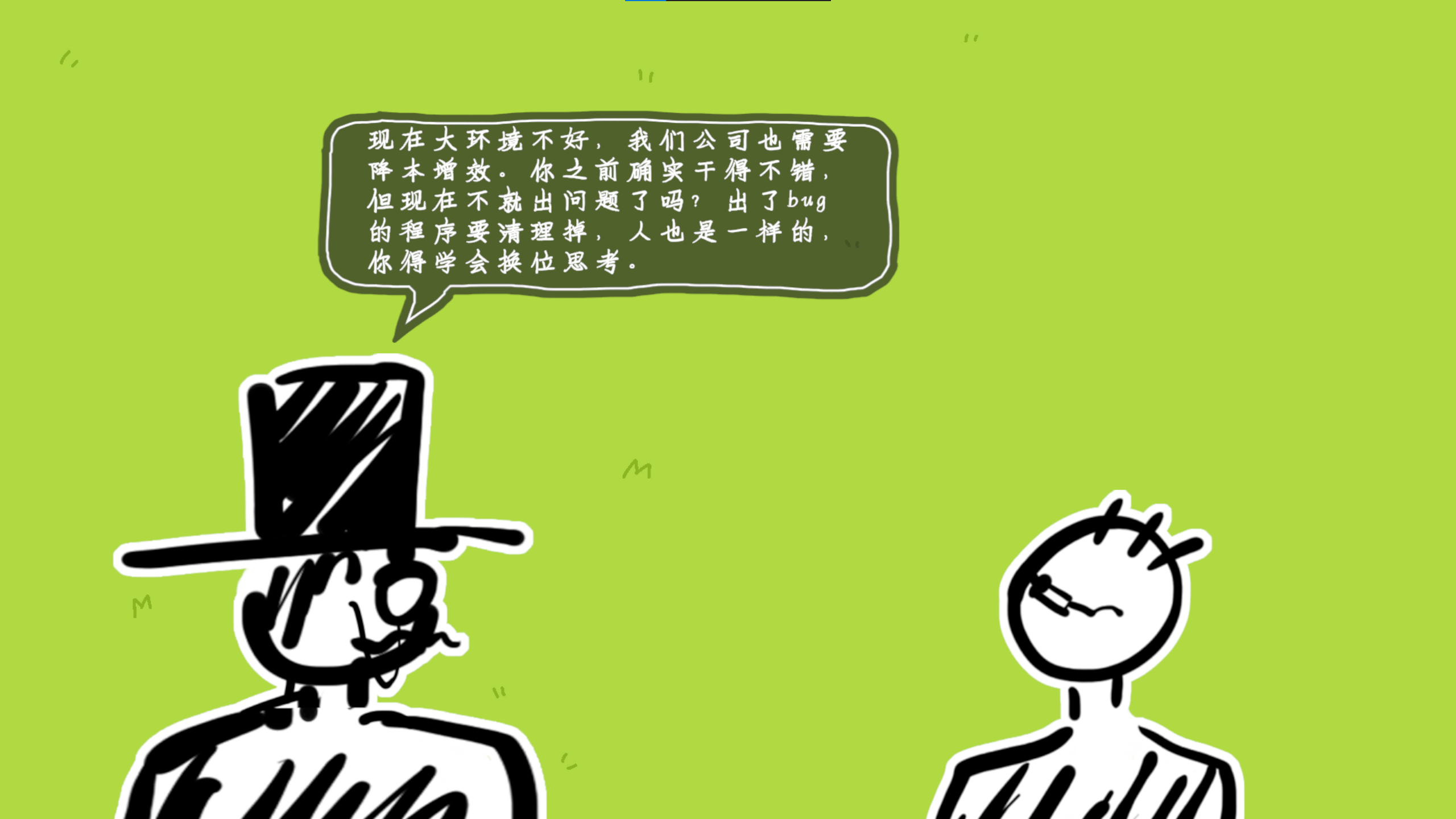 这个游戏有点冷了。是很有设计的游戏,值得一试。对话框UI是Mac的文件夹窗口。主角去打哥布林,结果最后剩下的那个哥布林是程序员。会把主角回退到以前各种各样的bug版本呢。主角就像被上了各种debuff一样。有人物出屏幕的bug。
