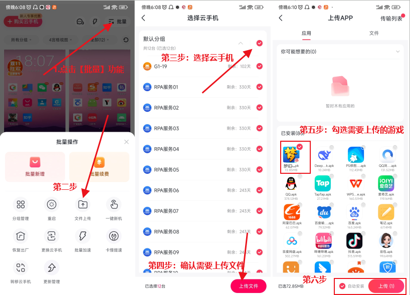 再将梦幻西游互通版安装包批量上传至云手机,批量完成安装和账号登录,借助电脑端的同步操作功能,可同时控制多个账号执行任务,大幅提升效率。