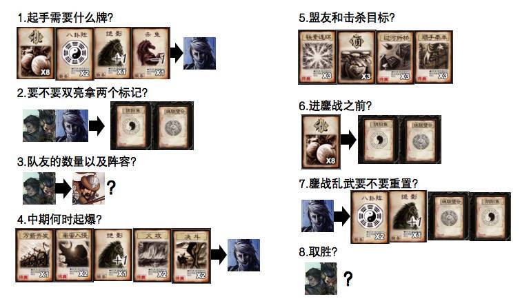 【南蛮入侵】【万箭齐发】,和身份场一样,是贾诩的key牌,需要贾诩判断其他所有人手里杀多还是闪多,灵活调整【乱武】【万箭齐发】【南蛮入侵】的先后顺序,使得低血武将的由贾诩来击杀,获得更多奖励牌。