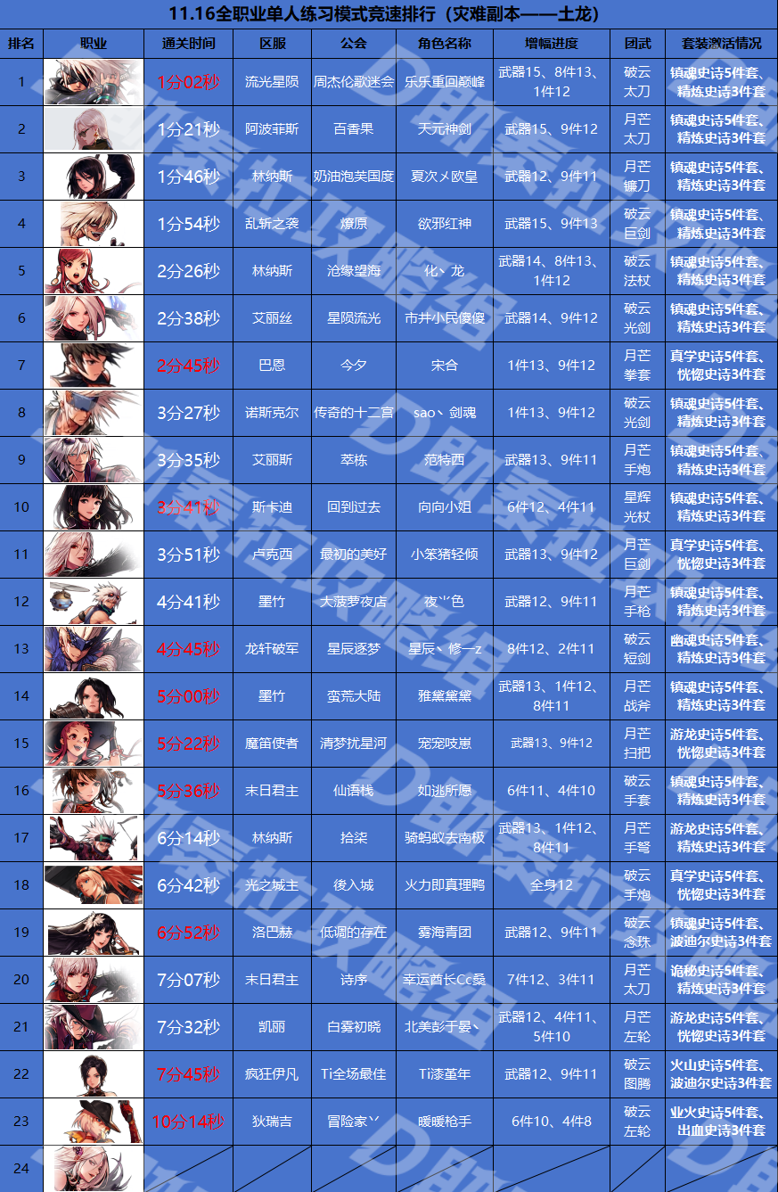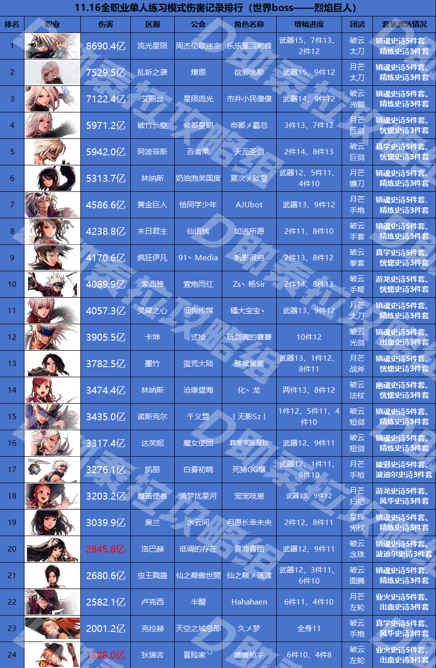 注:现因单人练习排行榜有高伤害限制,单人超过3500亿的成绩有较大的概率不会在游戏排行榜显示,所以可能会丢失一些职业记录,欢迎大家将一些高伤害记录投稿,笔者都会积极采纳的,另外装备打造为排行榜外显装备,与实际打伤装备可能存在差异